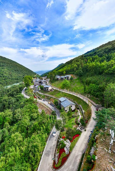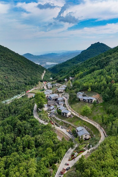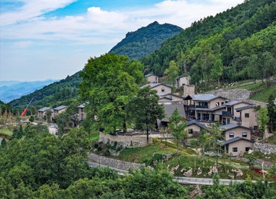 图为2025年9月16日,四川省华蓥市红岩乡即将投入营运的“十里芳菲?红岩美村”精品民宿群,在群山怀抱和蓝天白云映照下显得格外和美。(邱海鹰/摄影报道)