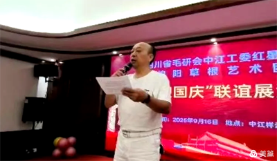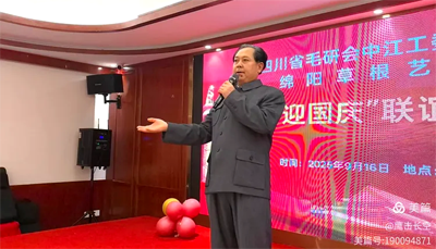 在演出中途,省毛研会副会长兼中江分会会长吴启学同志发表重要讲话。他高度评价了此次联谊展演的意义,指出活动不仅是一次艺术的交流,更是对毛泽东思想的传承与践行。吴会长强调,在新时代背景下,文化工作者要坚守初心,以艺术为载体,讲好中国故事,传递中国声音。他鼓励两地艺术团体继续创新,推出更多接地气、传得开、留得下的优秀作品,为丰富群众精神文化生活、推动文化自信自强贡献力量。