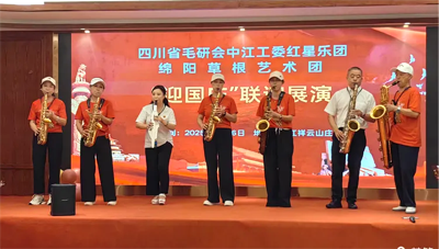 最后,省毛研会中江分会红星乐团与绵阳市草根艺术团携手奏响《歌唱祖国》与《友谊地久天长》,联谊展演在全体演员与观众的热烈掌声中圆满落下帷幕。器乐合奏激昂澎湃,歌声与旋律交织成对祖国的深情礼赞,也象征着两地艺术团体携手共进的深厚情谊。