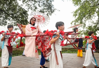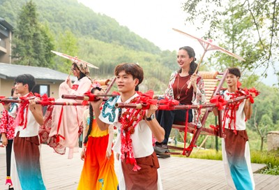 2025年10月1日,外国留学生在四川省华蓥市红岩乡“十里芳菲·红岩美村”山居民宿,体验非遗“华蓥山滑竿抬幺妹”,与当地群众共同欢度中国国庆、迎接中秋佳节。