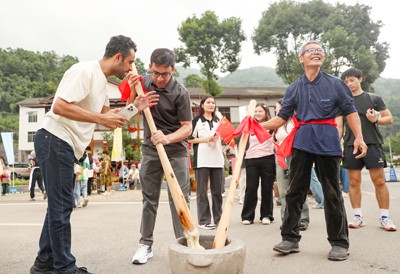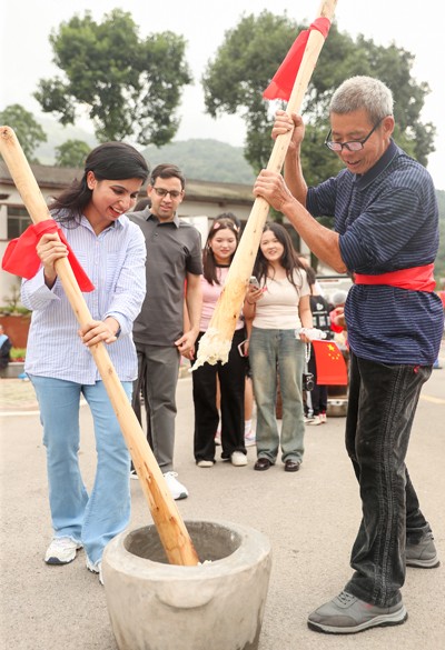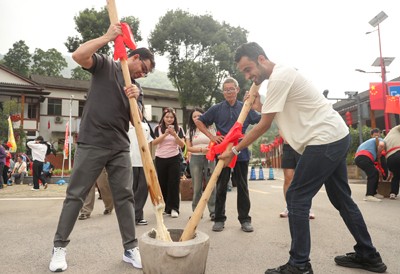 2025年10月1日,外国留学生在四川省华蓥市红岩乡场镇体验民俗打糍粑,与当地群众共同欢度中国国庆、迎接中秋佳节。