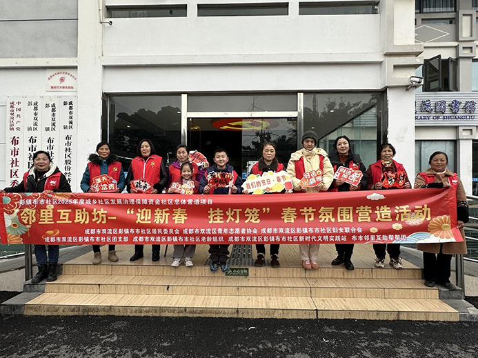 为弘扬中华优秀传统文化,营造喜庆祥和、邻里和睦的新春氛围,拉近邻里距离,凝聚社区温情。2月9日,彭镇布市社区老体协分会联合双流区青年志愿者协会、布市邻里互助帮帮团开展了邻里互助坊-“迎新春·挂灯笼” 春节氛围营造活动,邻里互助帮帮团志愿者、社区党员志愿者及社区居民携手参与,用红灯笼点亮家园,共迎马年新春。