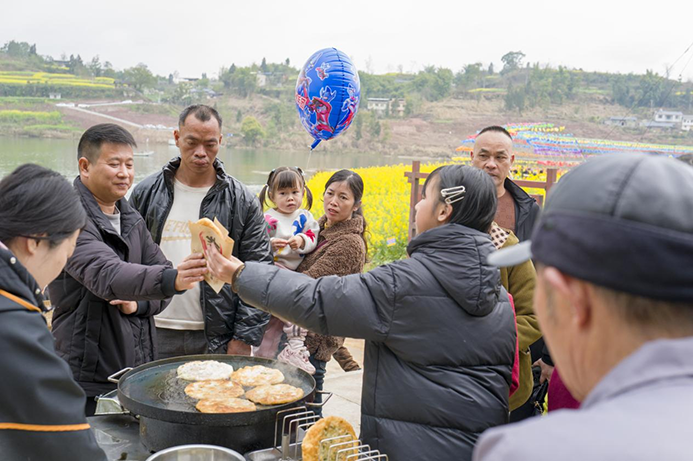 活动现场精彩纷呈,金色油菜花海与嘉陵江美景交相辉映。开幕式热闹非凡,“春风送暖菜花黄 开心跑出彩时光”乡村跑、放风筝、垂钓、摸鱼、抓鸡兔等趣味项目轮番上演,汉服爱好者漫步花间,衣袂飘飘,成为花海中一道古典雅致的美景;讲评书、烤面包等特色体验活动,让游客在赏景游玩之余感受民俗文化与手工乐趣。