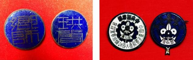 图(1)→“乡师”“珙简”两枚铜质校徽,是1930年,珙县创建的第一所学校珙简乡师、现在的珙县中学的前生的标志,也是目前发现的唯一标志;图(2)→“中央训练团中国童子军教导人员训练班毕业证章”“中国童子军服务员”章是当年珙简乡师的童子军教官、当地人罗怀忠的遗物。