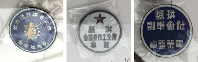 图(1)→“四川省珙县国术官毕业纪念章”;图(2)→“珙县卫生工作者协会证章”;图(3)→“珙县社会军事毕业证章”。三枚章都有“珙县”说明是本地的文物,三枚章都是繁体字,说明是新中国建立以前的文物。