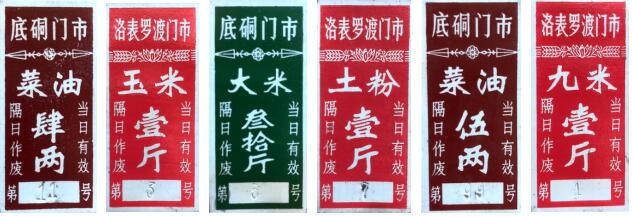 图(1)(3)(5)→分别是珙县底洞门市的菜油(肆两)、大米(叁拾斤)、菜油(伍两)的购物卡;图(2)(4)(6)→分别是珙县洛表罗渡门市的玉米(壹斤)、土粉(壹斤)、九米(壹斤)的购物卡。