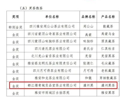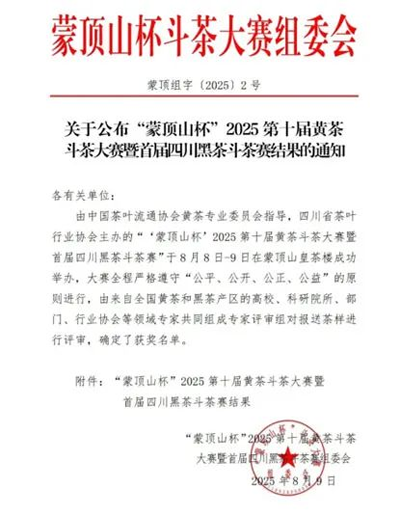 由中国茶叶流通协会黄茶专业委员会指导,四川省茶叶行业协会主办的“‘蒙顶山杯’2025第十届黄茶斗茶大赛暨首届四川黑茶斗茶赛”于8月8日﹣9日在蒙顶山皇茶楼成功举办,大赛全程严格遵守“公平、公开、公正、公益”的原则进行,由来自全国黄茶和黑茶产区的高校、科研院所、部门、行业协会等领域专家共同组成专家评审组对报送茶样进行了评审,并确定了获奖名单。都江堰市老科协茶研会和市茶叶协会选送的青城贡品堂茶业有限公司灌州黑茶荣获金奖。