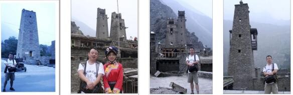 我带有照相机的三脚架,走到哪里都可以进行自拍,既可以留点到此一游的痕迹,也让图片资料更具有真实性,避免图片有嫖窃之嫌。图(1)是我在寨们前的留影;图(2)是桃坪羌寨的羌族姑娘很大方与我合影留念;图(3)(4)是我在寨子标志性碉楼建筑前的留影。