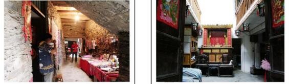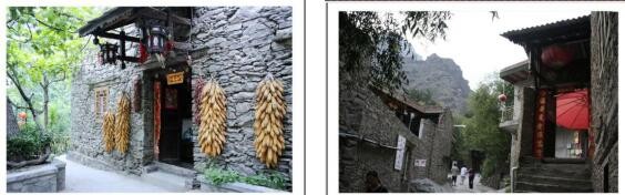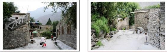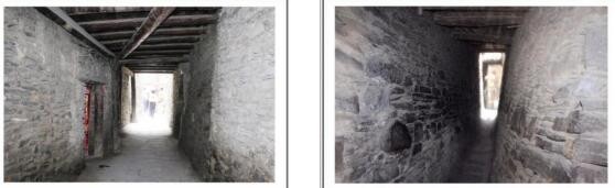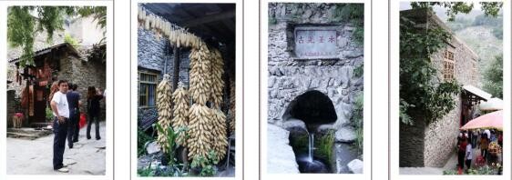图(1)我们一行的四人之一在桃坪羌寨街巷参观;图(2)寨子内的苞谷是吊在墙外不怕别人拿,不怕老鼠偷;图(3)寨子内的“古羌圣水”是经暗沟流至每家每户;图(4)寨子内地理位置的限制,街巷都比较狭窄。