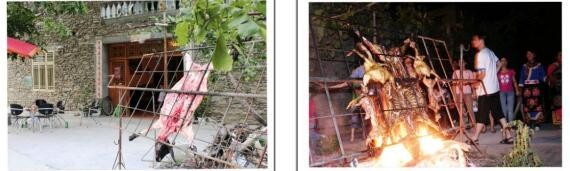 烤全羊有讲究,将一只整干净了的大全羊(增加了2只全鸡、2只全兔)绑在平铁架上,在院坝中的篝火上当众翻转烤制。平铁架是用直径12毫米粗的钢筋焊制的井字形,平铁架两端靠在焊有三格高低不等的铁支架上。开始时,下面堆的干木柴多火特别大,铁架支在最高位置。随着火势减小,将铁架降到中间格次。待篝火的木柴全部烧成碳状时,将铁架降到最低挡位。