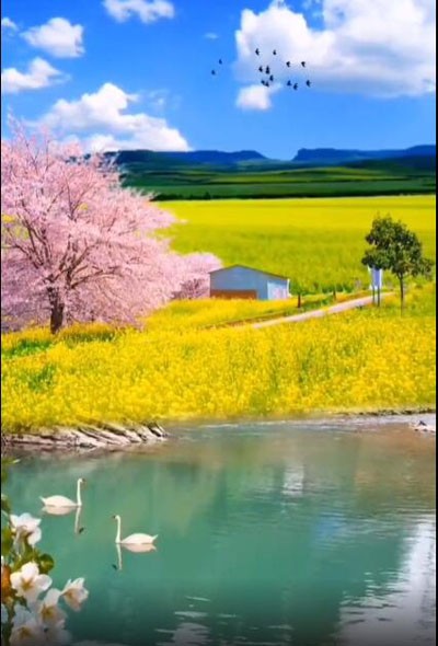 沃野田畴,绿浪翻波,瑞气绕川。看农家儿女,肩承劳作;田园麦稻,穗载丰欢。戴月披星,朝耕暮种,笑对桑麻心自宽。春归处,正菜花香漫,风舞云闲。