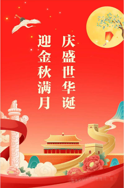焕彩重霄,鹤瑞清秋,盛典方遒。望黄河舞练,崩雷溅雪;长城铸史,腾蟒蟠丘。星火燎原,红船破雾,砥柱中流定鼎谋。罡风劲,看宏图漫卷,四海同讴。
