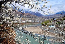 继而,小车于小沟内、花丛中向位于原金川农场高坡上的移动电话基站盘旋而上。一家人下车后,凭借“一览众山小”的地势举目远望,将金川河谷环抱中的沙尔、咯尔和庆宁乡尽收眼底:远处,山巅白雪皑皑,山下树木葱郁,河两岸梨树丛丛,绵延10多公里的山坡、河坝皆白茫茫的一色!彼时彼刻,我们心境豁然开朗,情绪为之升华,无不为视野里“千树万树梨花开”妆成的美丽壮观的景致所叹服!