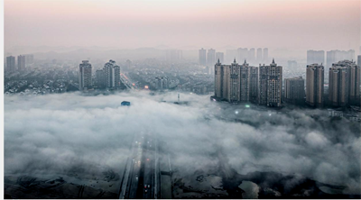 云海翻滚瑞气临,雾漫旌城如仙境。