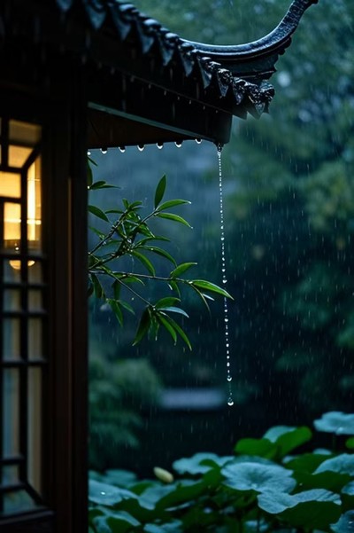 这首五言律诗以"初秋夜雨"为题,着力描绘初秋夜雨的清新意境。首联"初秋夜雨凉,檐滴碎琳琅"点明时节与场景,"碎琳琅"一词将雨滴声比作碎玉之声,既形象又富通感之美。颔联"风送桂花气,窗含竹叶光"巧妙化用知识库中"风摇桂子暗香浮"的意象,以"桂花气"与"竹叶光"勾勒出视觉与嗅觉交融的夜雨画卷。颈联"露凝荷上重,云卷月中藏"进一步拓展空间层次,展现雨中荷露与云月的微妙变化。尾联"此际心无碍,悠然入梦乡"则由景入情,表达初秋夜雨带来的内心宁静与超然物外之感。全诗用词精炼华美,意象清新雅致,情感由外而内自然流转,恰如秋雨般洗尽尘嚣,令人心旷神怡。