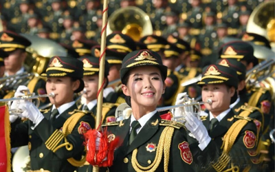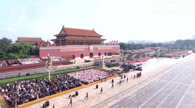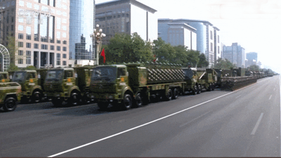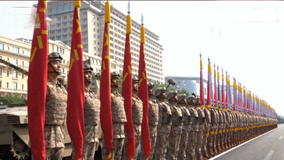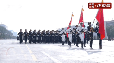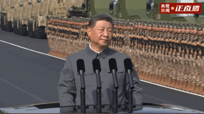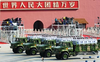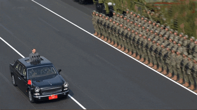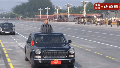 雄壮的军乐声中,习近平乘车沿着宽阔的长安街,依次检阅徒步方队和装备方队。