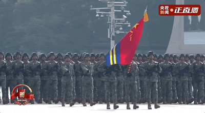 检阅车行进至党旗、国旗、军旗前,敬礼号角响起,习近平停车肃立,以注目礼向三面旗帜庄严致敬。