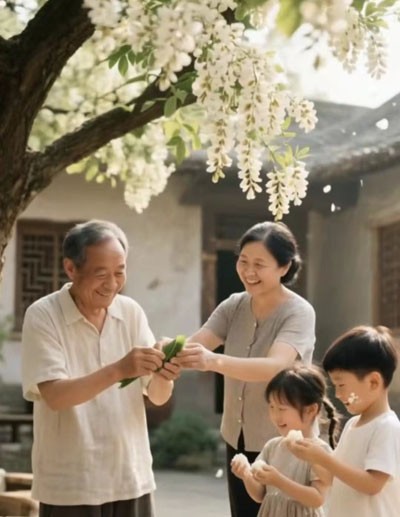 夜深了,雨停了。月光透过天井洒进来,照在八仙桌上的铜壶上,泛起一层银光。阿瑾坐在桌旁,翻看母亲留下的旧相册。照片泛黄,边缘卷起,可笑容依旧清晰。有一张是全家在院子里包粽子,父亲笨拙地卷着粽叶,母亲笑着纠正他的手法,她和弟弟则偷偷把糯米捏成小团子扔着玩。那天阳光正好,槐花落在肩头,风里全是家的味道。