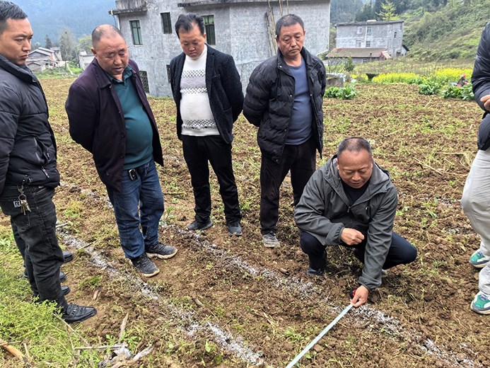 在种粮大户何友权流转的400余亩酿酒专用粮种植基地,特派团副团长贾复生聚焦春耕生产关键环节,开展了全面细致的技术讲解与现场示范。他结合地块实际情况,围绕耕地质量提升、优良品种选择及种子打破休眠处理、大豆玉米带状复合种植技术、科学精准施肥(施肥量与施肥时期)、中耕除草及适时收获等核心内容,深入浅出地传授实用生产技术,并亲自进行操作示范,切实为春耕生产提供有力技术支撑。