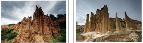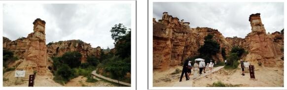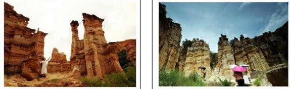 土林中有的像巨剑冲天,有的像刀脊横地,有的像展翅欲飞的雄鹰,像奔驰的骏马,有的像戴头盔的纠纠卫士,有的像摇扇苦吟的书生,还有“玉女观云”“母子偕游”的立体群像,真可谓鬼斧神工,令人叹为观止。