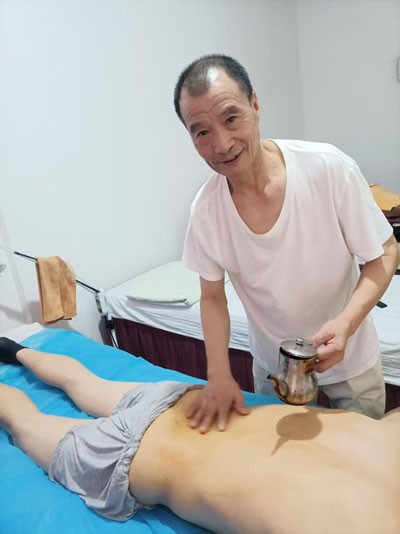 周明贵医生正在用独家秘制药酒给患者治疗腰部疾病