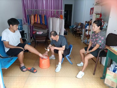 周明贵医生正在给湖北省一名高中生患者治疗脚部疾病
