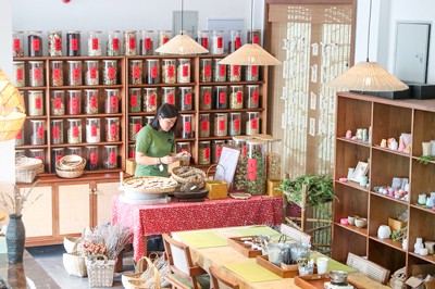 华蓥市红岩乡山居民宿“十里芳菲?红岩美村”的工作人员,在整理当地特有的供游人手作体验的山地产品。