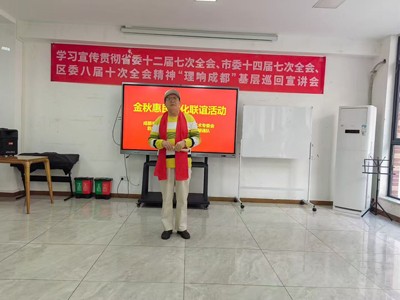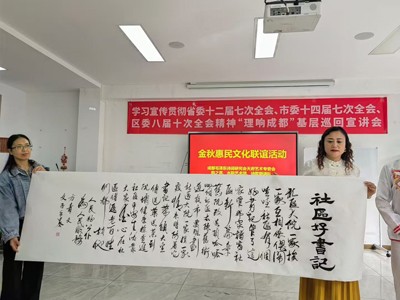 2025年10月13日,成都毛泽东诗词研究会天府艺术专委会在西南街社区举行了“金秋惠民文化联谊”活动。表演了“多民族唱红歌”,诗朗诵《青春中国》和原创歌曲《社区有个好书记》等等,并现场书写歌词,并现场亲自赠予社区书记!学会始终坚持“六走进”,“三贴近”,以社区基层创作为基石,反映社区的变化,邻里的和睦,市井的烟火,祖国的祥和,为地方文化和天府增加活力和魅力!惠民文化和群众文艺蓬勃发展,人民幸福指数越来越高! (李宸莹/文图报道)