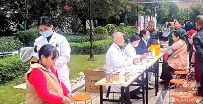 中西医结合医院医护人员,现场搭建义诊服务区,为老年业主们提供免费基础体检(含血压、血糖测量、视力检测),同时针对老年人常见的高血压、糖尿病、关节疼痛等问题提供专业咨询,发放健康养生手册,提醒老年人日常健康知识。