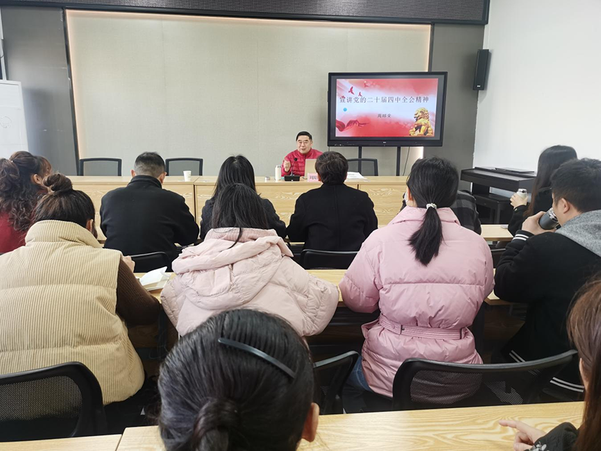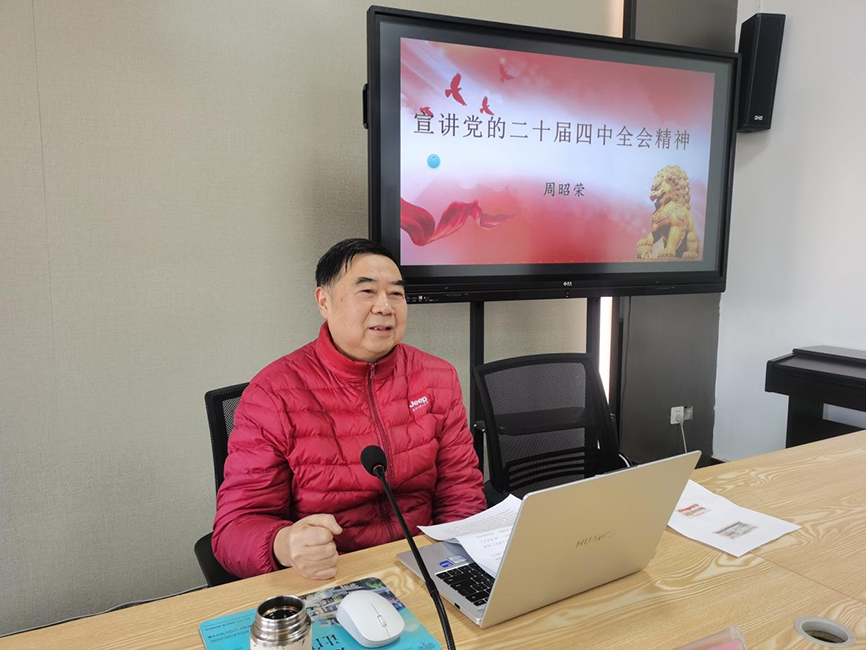 11月28日,内江市“理响甜城”和“银龄之声”宣讲队成员、市党员教育师资库教师、近50年党龄的老党员周昭荣在内江市市中区城西街道为街道、社区党员干部、居民代表宣讲党的二十届四中全会及省委十二届八次全会精神。便民服务中心主任张金龙主持宣讲会,党工委书记罗红利在周昭荣宣讲后提出了学习贯彻全会精神的意见。