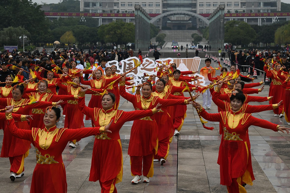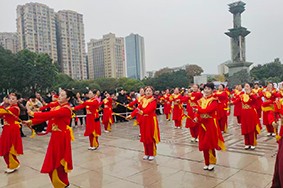 下午3时30分,巡游活动正式开始。《幸福中国一起走》等四首耳熟能详的歌曲循环播放,队员们身着中国红服饰,迈着整齐步伐登场。他们时而挥舞竹棍让莲响清脆作响,时而敲响腰鼓让红绸翻飞,动作刚劲有力、气势磅礴,将川东民俗魅力展现得淋漓尽致。