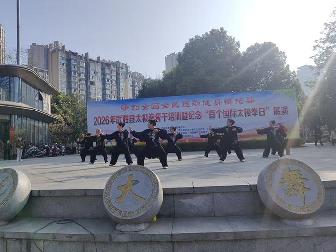 3 月 21 日,世界首个国际太极拳日当天,武胜县人民广场太极神韵飞扬、场面热烈隆重,纪念世界首个太极日展演活动成功举办。