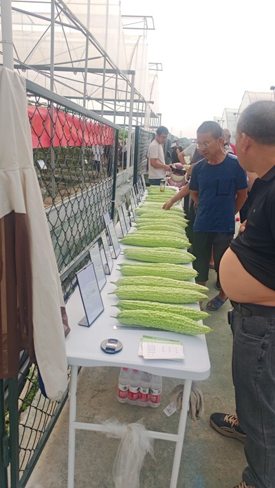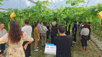 2025年9月15日,成都市老科协联合郫都区老科协,在成都金田种苗公司蔬菜种苗生产基地,举办秋季蔬菜(苦瓜)新品种田间现场培训会。成都市老科协服务“三农”工委主任余建明、郫都区老科协会长彭富全到会指导并发言,来自郫都、彭州、龙泉驿及眉山、德阳、绵阳等地的107名蔬菜种植大户参会。