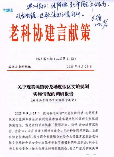 2025年9月23日,威远县老科协“天府银龄行动”志愿服务队文化旅游专委会分队到观英滩镇骑龙坳度假区调研文旅规划实施情况,县文广旅局和观英滩镇在调研座谈会上介绍了骑龙坳旅游度假区的规划和建设情况。志愿者们围绕骑龙坳旅游度假区的文化旅游资源现状、文化旅游专项规划和民宿产业发展中存在的问题进行了全面深入研讨,形成了《关于观英滩镇骑龙坳度假区文旅规划实施情况的调研报告》。县老科协于2025年9月29日以《老科协建言献策》2025第5期(二届第11期)呈送县四大家主要领导和分管领导阅示。