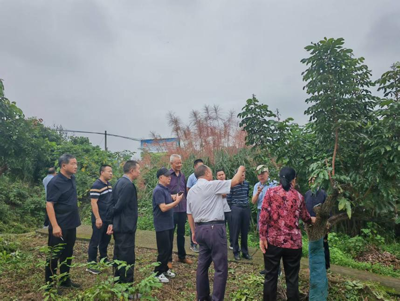 随后,调研组前往永川区朱沱镇“龙眼品种改良示范基地”调研。今年5月由泸县专业队伍对该基地的25亩龙眼实施了高接换种,成活率在八十五以上,泸县老科协果树专家张运华现场作了后期管理技术指导,2027年有望全面挂果,并为全镇品种改良提共了种源。朱沱镇副镇长冯扬陪同。