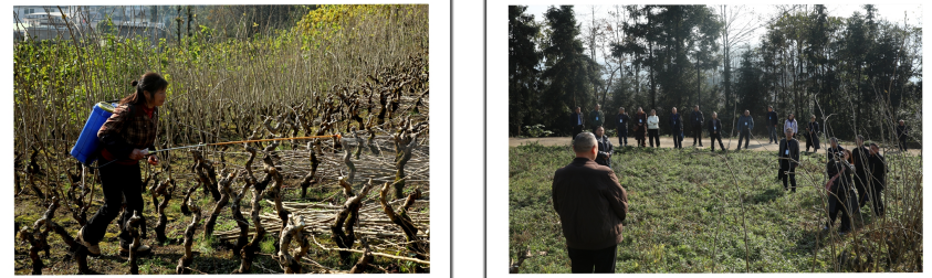 左图:蚕农在为桑园安全越冬喷药管理;右图:智溢公司景阳茧站站长李保清介绍桑园管理