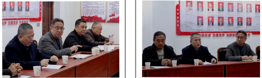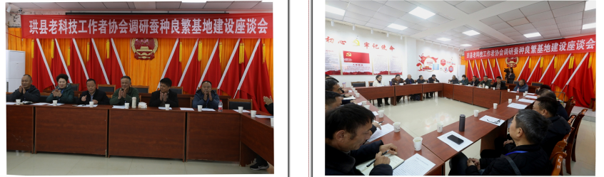 左图:珙县老科技工作者协会成员、珙县蚕桑办公室原主任代家权(左2)在座谈会上介绍全国和珙县蚕种情况,强解蚕种安全的重要性;右图:智溢公司副总经理、高级农艺师秦继彬(中)在座谈会上介绍“桑蚕一代杂交种繁育区域试验”的总体情况。