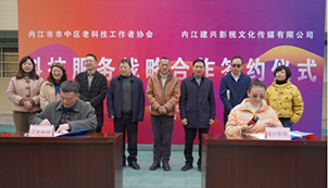 座谈会后,与会领导和嘉宾见证了内江市市中区老科协与内江建兴影视文化传媒有限公司科技服务战略合作协议的签约授牌仪式。
