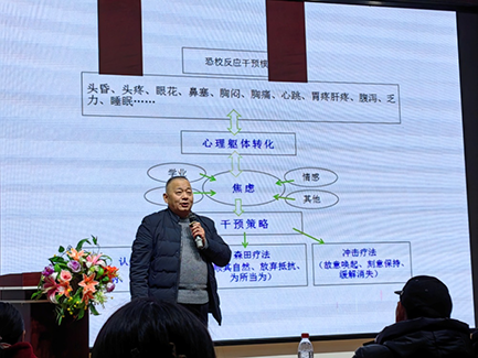 在问题总结阶段,教科委主任、心理咨询与辅导专家王小林做“学生恐校反应的识别与干预”专题讲解。王教授认为,学生不愿意去上学的问题,不能全部归结为厌学、拒学,很多学生存在“恐校反应”,即对在学校时发生的那种生理、心理上的“恐惧现象”的恐惧。恐校反应形成的主要原因有两个,一是学业上“想学好而学不好”,又缺乏应对策略和方法,从而引发高焦虑。二是人际关系方面“相处好而处不好”,人际认知偏差、沟通技巧欠缺所致。学生的高焦虑释放不了,严重的时候就可能发生两种现象,一是“心理躯体转化”,即焦虑通过躯体问题表达出来,比如头昏、头疼、咽喉痛、耳鸣、胸闷、心跳、胃痛、腹泻、肢体发抖等,甚至周身乏力、睡眠困难。二是类似惊恐发作的一些症状,眩晕、呕吐、心慌、气短、头脑空白、濒死感觉等。