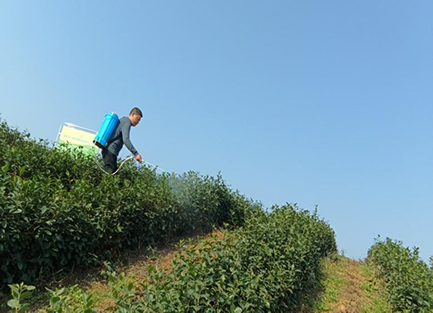他们一行来到银星村马仁刚的茶园,选定了施用微生物菌剂用于对比的茶行,并向马仁刚讲解了施用方法和注意事项。