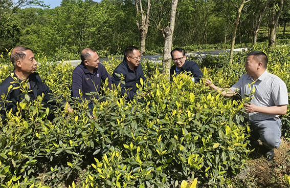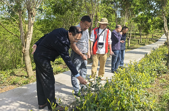 调研团队实地察看茶树生长态势,对基地生态种植模式给予肯定。据谭总介绍,园区注重生态可持续发展,套种黄花3000株、紫荆树20000株,实现生态与增收双赢;同时引进国内外茶树品种360余个,产品涵盖五大系列100余品种,构建起规模化、多元化种植体系,为优质茶叶生产筑牢基础。