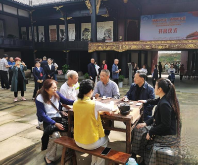 在南华宫的大院里,与会人员观看了书画展、古琴演奏表演,坐在大方桌上品茗,享受着秋日的暖阳。