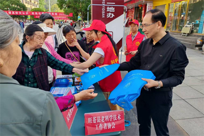 【旺苍县老科协会长赵元勋(右一)发放宣传资料】