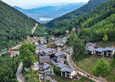 图为2025年9月16日,四川省华蓥市红岩乡即将投入营运的“十里芳菲?红岩美村”精品民宿群,在群山怀抱和蓝天白云映照下显得格外和美。(邱海鹰/摄影报道)