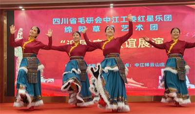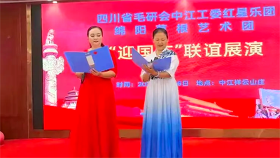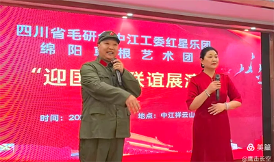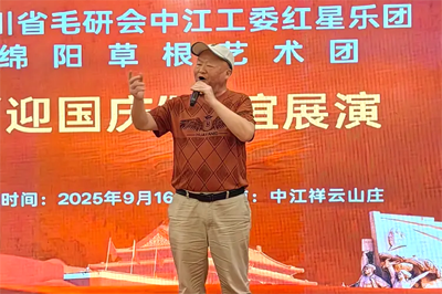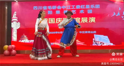 2025年9月16日,初秋的祥云山庄层林尽染,金风送爽。四川省毛泽东诗词研究会(以下简称“毛研会”)中江分会红星乐团与绵阳市草根艺术团“迎国庆.联谊展演”活动在此隆重举行,以艺术为纽带,共庆祖国76华诞,传承红色文化,弘扬时代精神。本次活动由叶洪青、何丽蓉主持,现场气氛热烈,掌声如潮,成为中江县文化交流领域的一次盛会。