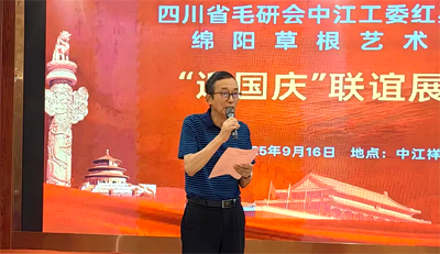 联谊展演活动前,毛研会中江分会副会长邓肃清讲话。他首先对绵阳市草根艺术团的到来表示热烈欢迎,并感谢四川省毛研会中江分会及社会各界的支持与指导。邓肃清团长表示,此次联谊展演不仅是两地艺术团体交流学习的宝贵机会,更是传承红色文化、弘扬社会主义核心价值观的重要实践。他强调,红星乐团将以此次活动为契机,不断提升艺术水平,力争成为中江县乃至四川省的文化名片,为实现“以文化人、以文育人”的目标不懈努力,最后,他预祝活动圆满成功,现场响起雷鸣般的掌声。