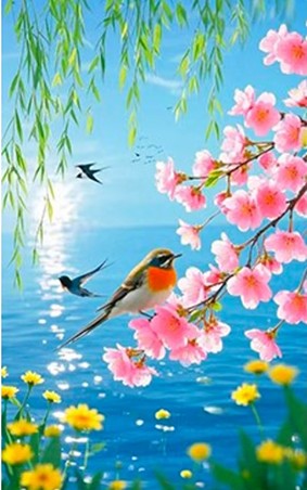河岸边,草色悄然染绿了,不是初春那种怯生生的淡黄,而是透着生命力的翠绿。柳条抽出嫩黄的新芽,在风中轻摇,似少女的裙裾,拂过春水微澜。柳枝上的露珠随着风势滴落,在河面激起一个个小小的涟漪。梨花如雪,纷纷扬扬开满枝头,洁白中透着微粉,静谧而温柔,花瓣在微雨中飘落,给地面铺上一层薄薄的白毯;桃花则灼灼其华,一簇簇、一片片,将山野点燃成绯红的云霞,远远望去,仿佛山间燃烧着温柔的红。蔷薇攀上篱笆,悄然绽放,暗香浮动,那花香不似玫瑰般浓烈,而是淡淡地渗透在空气中,不仔细闻竟不知其所在。