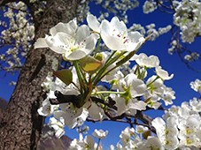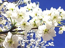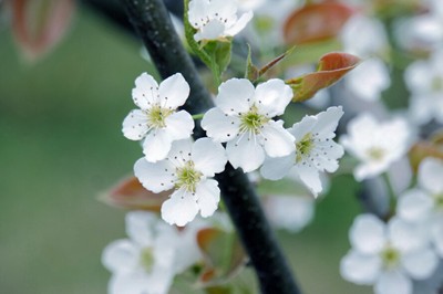 接着,我们乘兴迈进路边一家农户的梨园。目光所及,无论是奇崛苍郁的老树上,还是粗大茂盛的壮树上,梨花或含苞待放、或花蕊绽开,或一朵朵、或一簇簇,密密匝匝地挂满枝头。走到树下仰望,那梨花在刚抽出的一枚枚嫩黄色的叶片映衬下显得那样的白——白得晶莹,白得水灵,白得纯洁,白得耀眼;和风习习拂过,花瓣微微颤动,令人顿生怜爱,不禁怦然心动;一阵微风吹来,就有花片似雪花般飘洒而下,或落在头发间、衣服上,或躺在大家匆忙伸出的手掌里,端详把玩之间,令人情趣盎然!