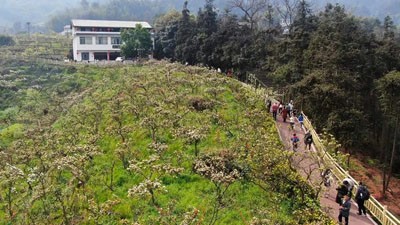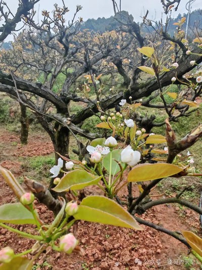 春日迟迟,卉木萋萋,蜀南长宁,佛来灵山,春雷初醒,千峰竞秀。当是时,梨云漫卷,雪浪翻涌,万亩琼林,香浸天地。游者纷至,或踏青寻芳,或访古探幽,共赴一场梨花胜会。佛来之梨,非寻常可比。其树或参天蔽日,或虬枝盘曲,或新芽如星,或老干生苔。晨雾未散,梨花似笼轻纱,若隐若现;日影初临,玉瓣凝露,莹莹如琢。及至晌午,金光漫洒,花影斑驳,恍若瑶池仙子遗落银簪,碎玉点点,缀满青峦。暮色四合,晚风徐来,暗香浮动,更添“月下梨花”之清绝。时有蜂蝶穿花,山雀啁啾,幽谷生韵,灵山自鸣。