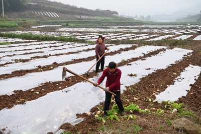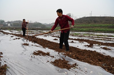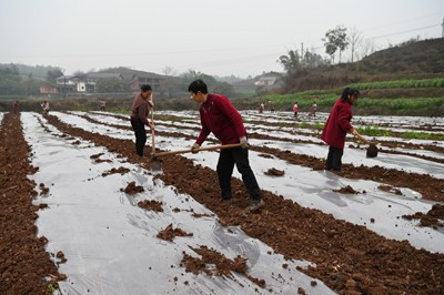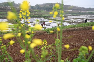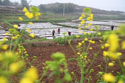 刘忠平介绍,脚下的这片地有400多亩,刚收割了萝卜,地膜覆盖好后,等两天就播种早甜糯玉米,20天后再套种早大豆。伴随刘忠平手指的方向放眼望去,望不到尽头的地里已经覆盖好了地膜,白茫茫一片。泥土的芳香,绽放的胡豆花,含苞待放的油菜花骨朵,以及挥舞锄头劳作的人们,一幅春潮涌动的画卷,如诗般地绘就在万物复苏的田野上。